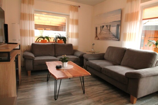 Durch die vielen großen Fenster ist der Wohn- und Essbereich hell durchflutet.