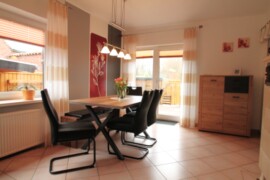 Durch die vielen großen Fenster ist der Wohn- und Essbereich hell durchflutet.