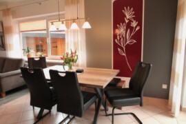 Im offenen Küchenbereich gibt es eine kleine Sitzmöglichkeit mit Tisch und 2 Stühlen.